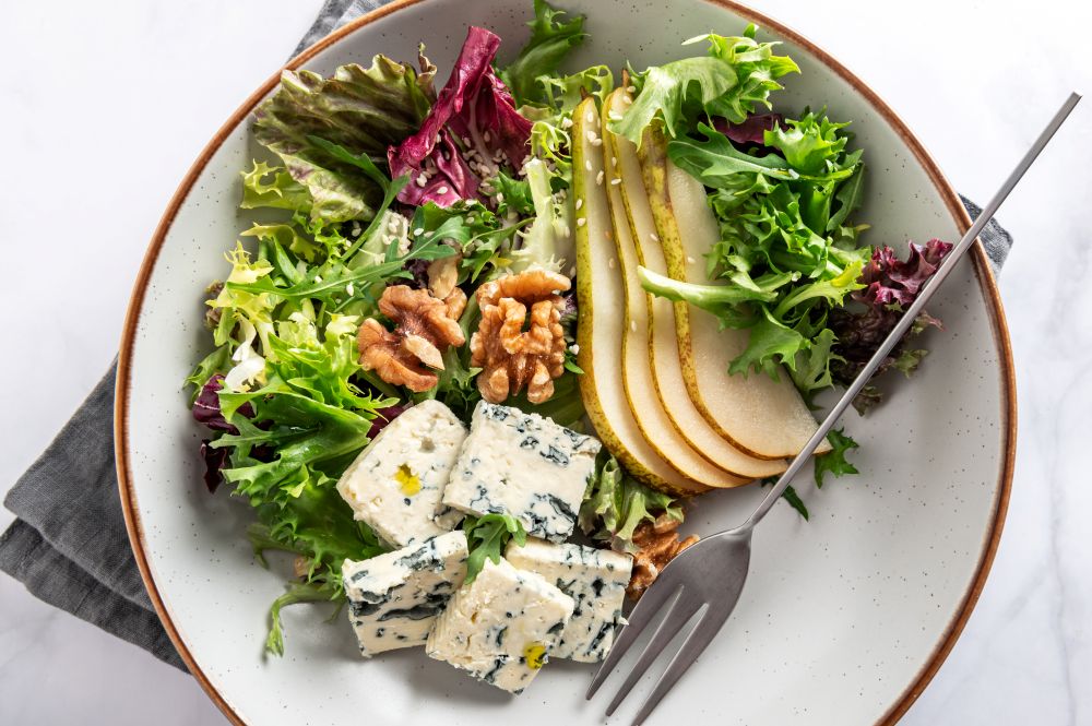 Egy nagy tálba halmozd a salátaleveleket, szórd rá a körteszeleteket és a morzsolt kéksajtot.