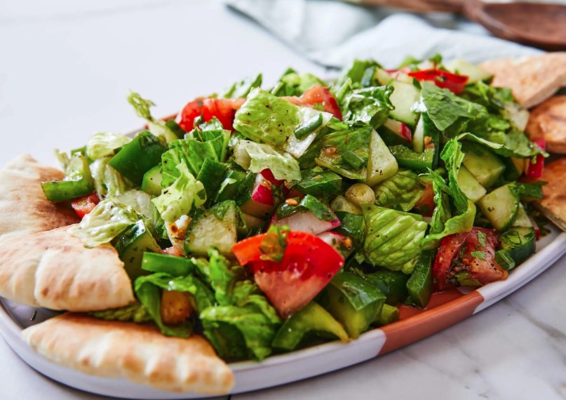 2-3 darab pita kenyér, kisebb falatokra tépve vagy vágva, 1 kisebb fej római saláta felcsíkozva, 2-3 érett darab paradicsom felkockázva, 1 darab kígyóuborka negyedekbe vágva és felszeletelve, 3-4 szál újhagyma felkarikázva, 4-5 szem retek, vékonyra szeletelv