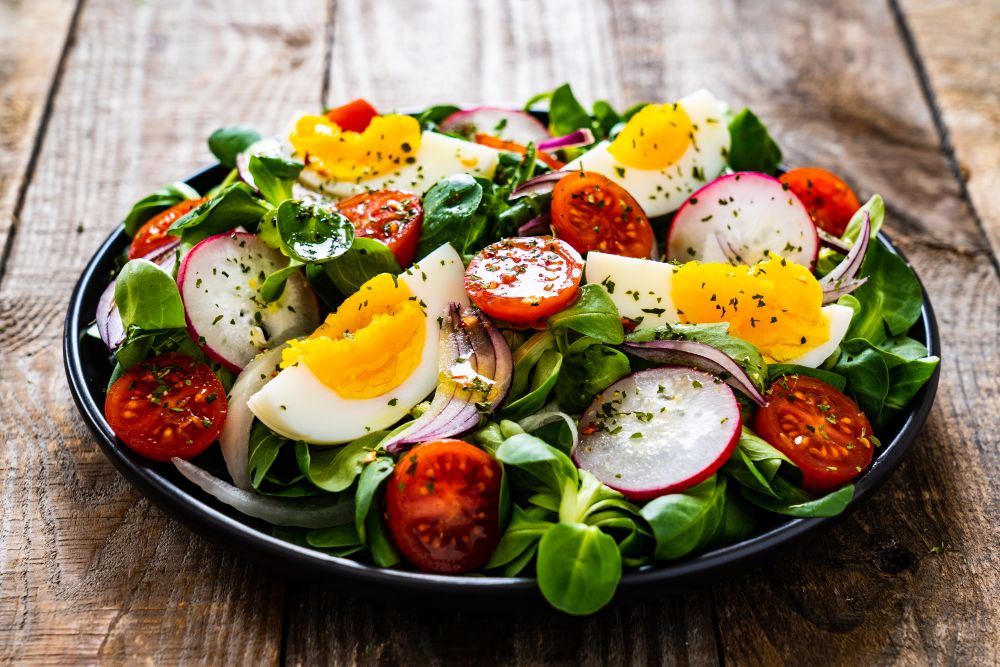 Egy nagy salátástálba tegyük bele a zöldségeket, forgassuk össze az öntettel, végül óvatosan helyezzük a tetejére a tojásokat (és a sonkát, ha használunk), hogy ne törjenek össze.