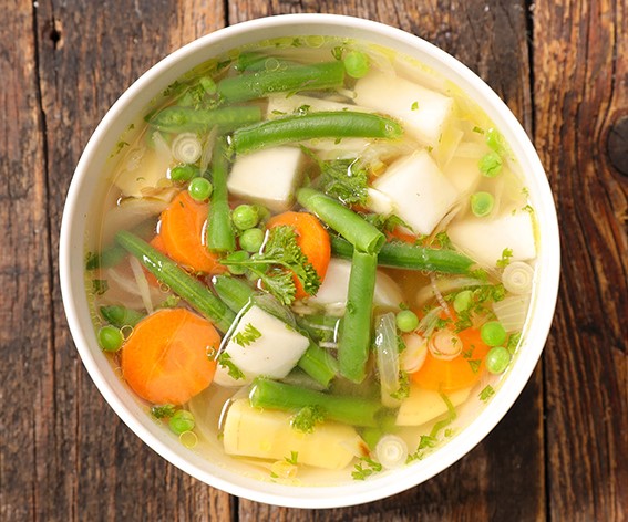 2 db sárgarépa, 1 db fehérrépa, fél karalábé, 2-3 db burgonya, zöldborsó,