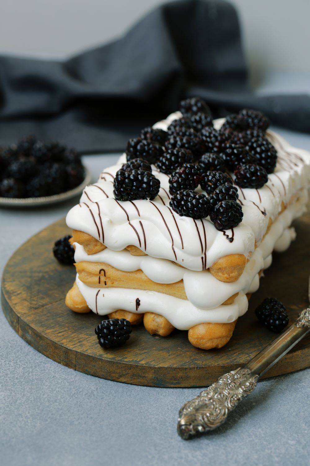 egy csipet sóval kemény habbá verjük, majd óvatosan beleforgatjuk a mascarponés krémbe. A babapiskótákkal kibélelünk egy nagyobb tálat vagy több kisebb poharat, vagy ráfektetjük kistányérokra. A piskótákra kanalazunk az összeturmixolt szederből, majd a mascarponekrémből, végül rádobunk 3-4 szem szedret. Ezután jön a következő réteg, ugyanilyen sorrendben: piskóta, gyümölcspüré, krém, szeder. Fogyasztás előtt néhány órára vagy akár egy egész éjszakára hűtőbe tesszük.