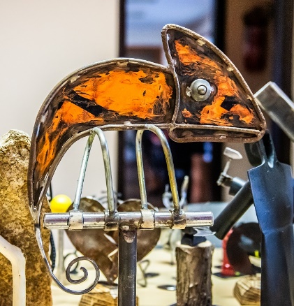 Igen, abszolút. Rengeteg fémhulladék van a sínek mellett, ami nem vasúti, hanem például a vonatról esik le. Minden helyszínbejárás után megfogadom, hogy legközelebb viszek egy táskát – végül persze sosincs nálam –, mert mindig lehajolok valamiért. Ha az a valami nagy, akkor egy szelvénykő vagy egy felsővezetéktartó oszlop közelében lerakom és később visszamegyek érte. Az asztalon látható kaméleon például a szőnyi megállóhely életvédelmi kapujának egy alkatrészéből alakult át: cserélnem kellett a lánckereket, ez lett a talapzat. Maga az állat pedig egy veszélyesáru-szállító szerelvényről leesett tábla.