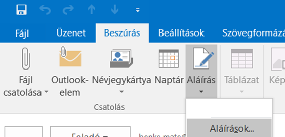 Ezt követően pedig a „Beszúrás” fül alatt az „Aláírás” gombra. A lenyíló listából válaszd az „Aláírások” menüpontot.
