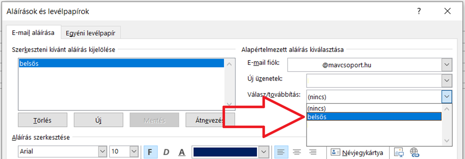 Végül állítsd be a Válasz/továbbítás menüpontban az újonnan létrehozott aláírás megnevezését, amely jelen esetben a következő: belsős. Így mentsd el beállításaidat, levelezőrendszered ennek megfelelően működik majd a továbbiakban.