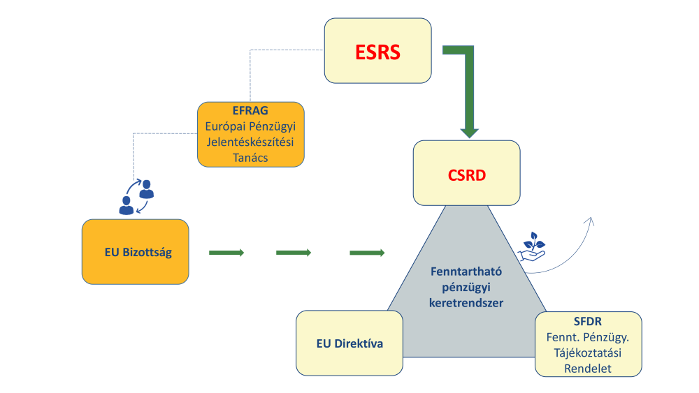 Az EFRAG (European Financial Reporting Advisory Group = Európai Pénzügyi Jelentéselőkészítő Tanács) felelős az ESRS (European Sustainability Reporting Standards = Európai fenntarthatósági beszámolási szabványok) kidolgozásáért, amelyek az EU-direktívában rögzített CSRD (Corporate Sustainability Reporting Directive = Vállalati fenntarthatósági jelentéstételi irányelv) megvalósításához szükségesek. A CSRD a vállalatok fenntarthatósági jelentéstételi kötelezettségeit szabályozza, míg az EU Bizottság irányítja e szabályozások kidolgozását és alkalmazását az uniós piacon. Ezenkívül az SFF (Sustainable Finance Framework = Fenntartható pénzügyi keretrendszer) célja, hogy elősegítse a fenntartható befektetéseket, melyhez az SFDR (Sustainable Finance Disclosure Regulation = Fenntartható pénzügyekről szóló tájékoztatási rendelet) biztosít átláthatóságot a pénzügyi piacon működő szereplők számára. A két rendszer – a CSRD és az SFDR – szorosan összefonódik, mivel mindkettő alapvető szerepet játszik a fenntarthatósági kockázatok és hatások átlátható és hiteles kezelésében.